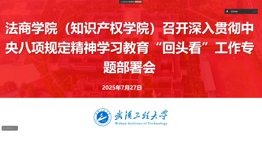 (通讯员 贺阳)7月26日晚,法商学院(知识产权学院)召开深入贯彻中央八项规定精神学习教育“回头看”工作专题部署会。学院党委委员及各党支部书记参会,会议由学院党委书记陈朝娟主持,重点传达学习上级文件精神、通报典型案例,并对下一阶段工作作出安排。