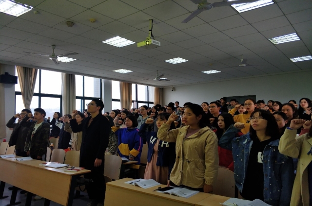 典礼伊始,全体起立,在激越高亢的国际歌歌声中拉开了本次开班典礼的序幕,随后全体入党积极分子和发展对象在党旗下进行庄严宣誓。