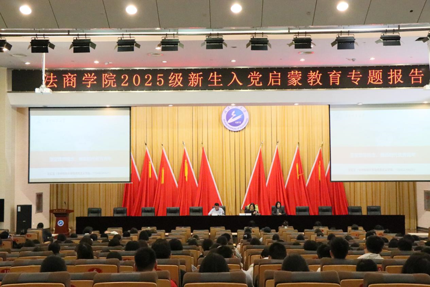 (通讯员 贺阳 陈奕含)为进一步增强2025级本科生和研究生对党的认识,坚定入党信念,引领新生扣好入党“第一粒扣子”。10月23日,法商学院(知识产权学院)在四教多功能报告厅组织开展入党启蒙教育活动,特邀华中科技大学马克思主义学院文红玉教授进行专题报告,学院党委书记陈朝娟、党委副书记孙勇、党务干事贺阳以及全体2025级本科生和研究生参加活动。活动由孙勇主持。