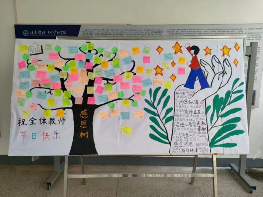 感恩之树,寄语情深。学院主通道设“感恩之树”板报,打造公共感恩墙。学生在便利贴上写上对老师的祝福以及想说的话张贴在“感恩之树”上。