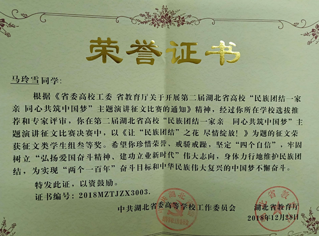 20181228日,我校18级马玲雪同学在第二届湖北省高校“民族团结一家亲同心共筑中国梦”主题演讲征文比赛决赛中,以《让“民族团结”之花尽情绽放!》为题的征文荣获征文类学生组叁等奖。