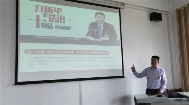 2019年4月22日,法商学院院长金明浩在武汉工程大学流芳校区L4102教室开办法商学院课程育人三分钟系列讲座第六期,利用课堂三分钟的时间,结合法学专业特性详细讲述了习近平总书记的法治观。金院长通过习近平总书记在各类会议上的发言,提炼了10条关于习近平总书记有关法治理论的论述,围绕习近平总书记“奉法者强则国强”的中心,引出习近平总书记“科学立法、严格执法、公正司法、全民守法”的十六字法治思想原则。通过习近平总书记的法治观,传导给法学专业学生正确的法治理念,告诫学生在学法、执法、用法的路上,应明确方向,不忘初心,向着一个中心点,提高认识,继续前进。