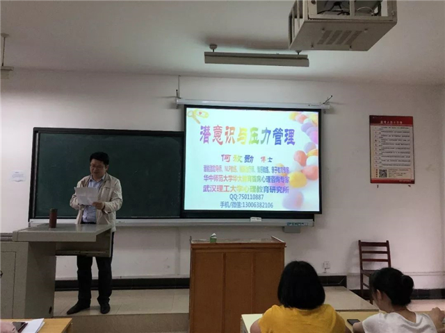 5月16日,全国知名临床催眠治疗专家、武汉理工大学心理教育研究所、华中师范大学华大教育培训中心首席心理咨询专家何放勋副教授做客法商学院心理健康教育专题讲座。讲解潜意识与压力管理,拓展师生对压力的认识和管理。讲座由法商学院院长金明浩主持,法商学院党委副书记刘念出席。学院班主任、学生心理委员共聆讲座。