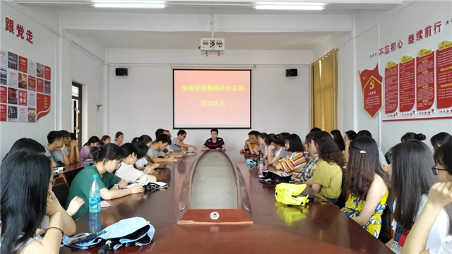 7月5日12:30,法商学院暑期社会实践团队在法商学院311会议室举行启动仪式,参会人员有:法商学院党委副书记刘念老师,院长助理付书科老师,李兆亮老师、辅导员兰海老师、辅导员方程成老师与本次暑期实践所有团队成员。