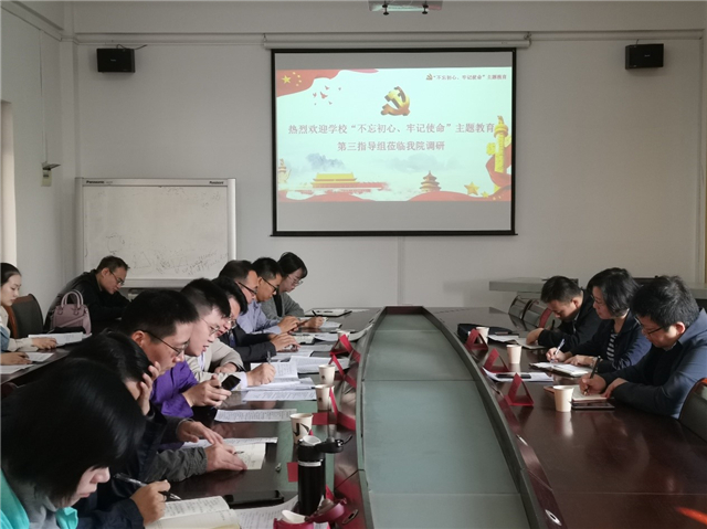 校团委书记兼法商学院党委副书记刘念向指导小组汇报了学院实施本次主题教育的调研内容、方式、整改措施和阶段性进展情况,并提出了几点建设性的意见。