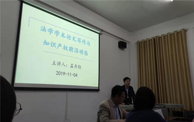 (通讯员  刘东野)2019年11月4日晚,武汉理工大学法学与人文社会学院孟奇勋副教授莅临我院,在法商学院311室做了关于法学学术论文写作与知识产权前沿动态的讲座。金明浩院长出席主持,60余名同学参加。