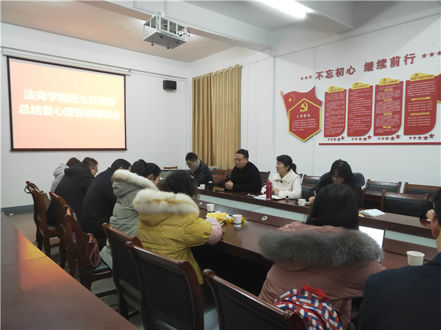 本网讯(通讯员 方程成)2020年1月6日上午,法商学院在西北区2号楼311室举办了辅导员、班主任年终总结会暨心理健康教育专题培训。学院党委副书记严敏、院长助理付书科、心理健康教育中心副主任雷辉及全院辅导员、班主任参加会议,会议由严敏书记主持。