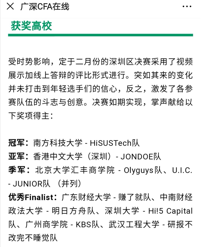 (通讯员 王嘉仪)2019-2020 CFA Institute Research Challenge 深圳区赛事于2月16日落下帷幕。来自华南20所高校的36支队伍参与本届投资分析竞赛,经过激烈角逐,我校代表队—来自法商学院的“研报不改完不睡觉队”冲入决赛,荣获优秀Finalist奖。