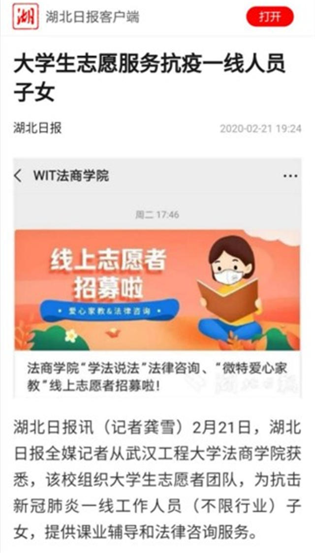 本网讯(通讯员龚雪 方程成)2月21日,湖北日报报道法商学院“微特爱心家教”“学法说法”法律咨询线上志愿服务团队为抗“疫”一线工作人员及子女提供课业辅导和法律咨询。