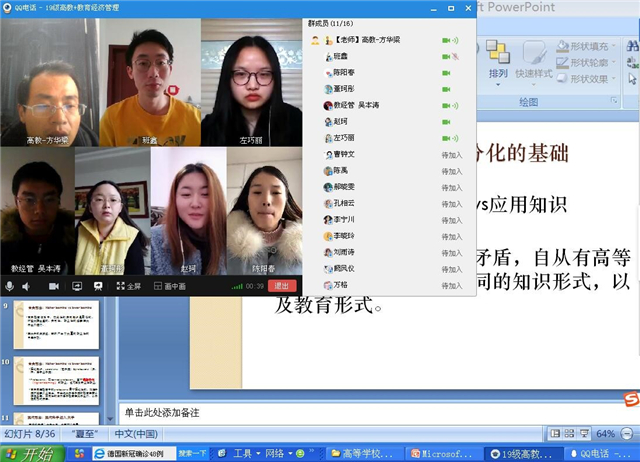 在线教学总体运行平稳有序开展。据统计,开学第一周全院共计36门课程展开线上授课,其中:研究生共有14门课程,本科生共有22门课程(32个课头)。学院任课教师积极克服在线教学准备中的各种困难,主动熟悉在线平台与工具、精心准备课件和教案,系统优化教学设计。任课教师整体精神面貌良好,课堂教学秩序井然,线上教学课堂气氛活跃,教师与学生互动情况较好,所有课程按计划完成。学生在线学生总体上比较平稳,课堂出勤率较高,研究生到课率为100%,本科90%以上课程为全勤。同时,学生信息员对上课教师效果评价优良率达98%,有的课堂师生共同讨论气氛浓厚,学生参与讨论人数近70%。