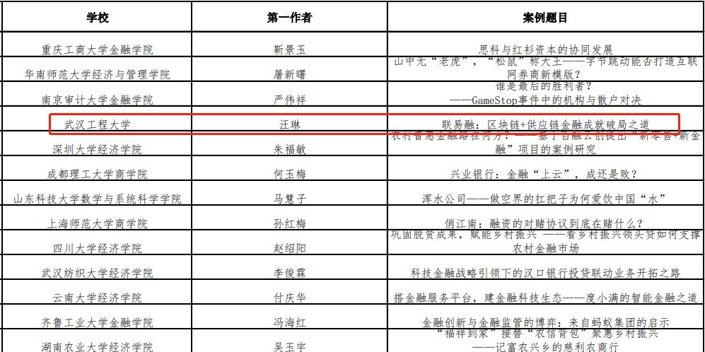 (通讯员 汪琳)7月20日,全国金融专业学位研究生教育指导委员会发布《关于第七届全国金融硕士教学案例大赛结果的公告》,法商学院汪琳副教授带领研究生欧文文、冯晶晶、郑婕、王绘撰写的《联易融:区块链+供应链金融成就破局之道》案例成功入选,并收录中国金融专业学位案例中心。