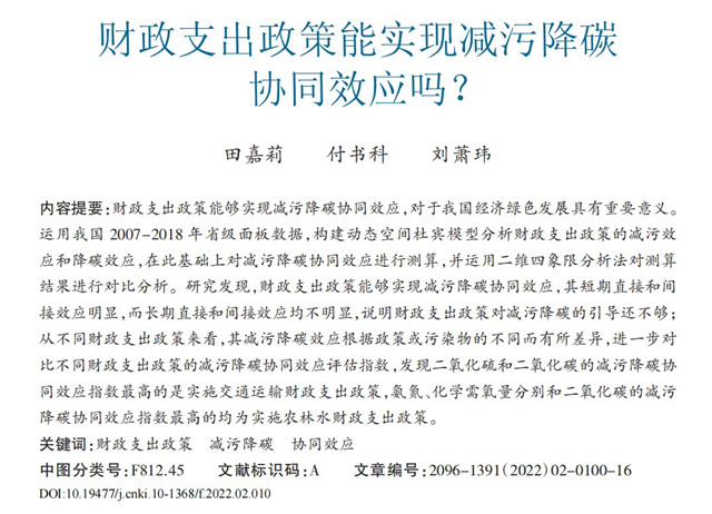 近日,我校法商学院教师田嘉莉、付书科和刘萧玮共同合作,以武汉工程大学为第一单位在《财政科学》2022年第2期发表论文“财政支出政策能实现减污降碳协同效应吗?”。该刊是由中央级研究机构——财政部财政科学研究院主办,是中文社会科学引文索引(CSSCI)扩展版来源期刊,主要发表与财政体制、税收制度与政策等方面相关的论文。