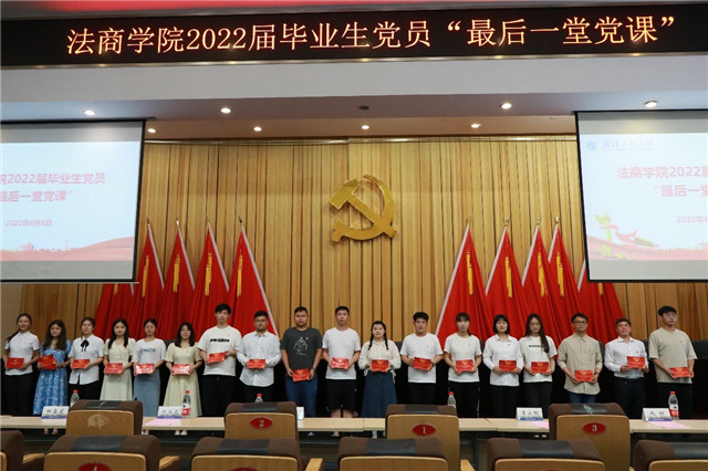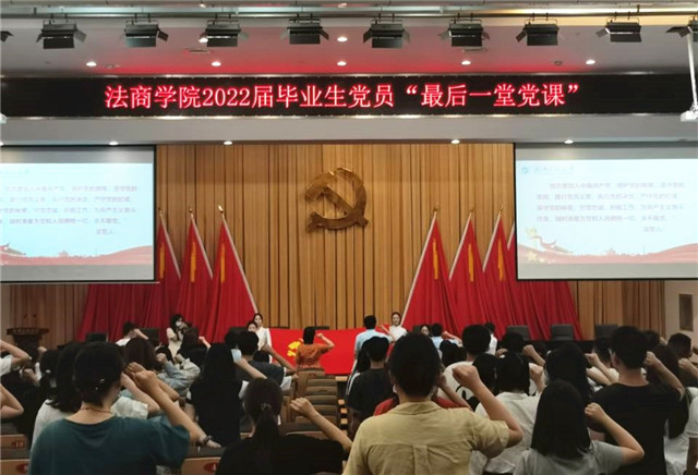 一样的毕业季,不一样的毕业礼。6月8日下午,法商学院在四教多功能报告厅举行2022届毕业生党员“最后一堂党课”,法商学院院长金明浩、副院长张艳、各教工党支部书记、学生党支部书记以及全体毕业生党员参加了活动。活动由学院党务干事王祥礼主持。