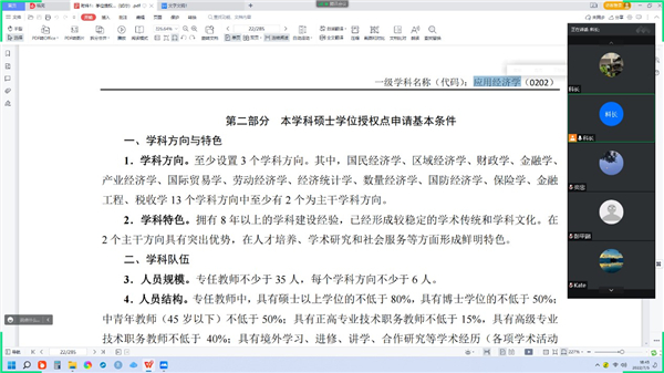 副院长付书科汇报了学院经济学学科发展历程和近年来学院在应用经济学一级学科硕士点申报上所做努力,带领大家详细学习了应用经济学硕士学位授权审核申请基本条件,并对应用经济学的学科方向、学科特色、人员规模、人员结构、学科带头人与学术骨干、课程与教学、培养质量、科学研究、学术交流、支撑条件等10个方面现状进行了深入梳理。他指出,随着师资队伍不断优化和人才培养成效不断提高,本科高校优秀基层教学组织和经济学本科省级一流专业的相继获批,为新一轮应用经济学硕士点申报提供了信心与动力,我们要迅速摸清家底,提前谋划,主动对接学校“十四五”人才培养主要目标,紧紧抓住每一个机会,在2023年力争获得应用经济学一级学科硕士点授权。