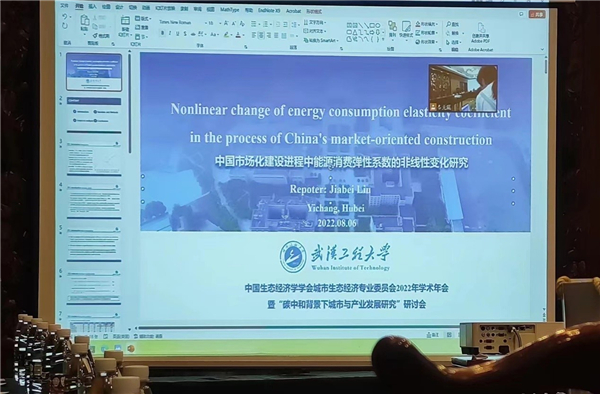 刘佳贝以《Nonlinear change of energy consumption elasticity coefficient in the process of China's market - oriented construction》为主题,从研究背景、变量及研究方法、实证检验、研究结论四个方面做了汇报。