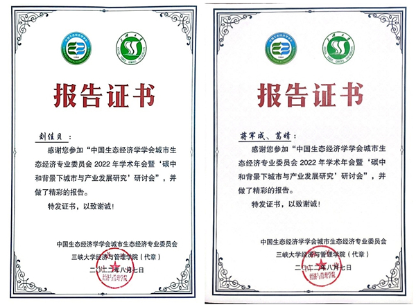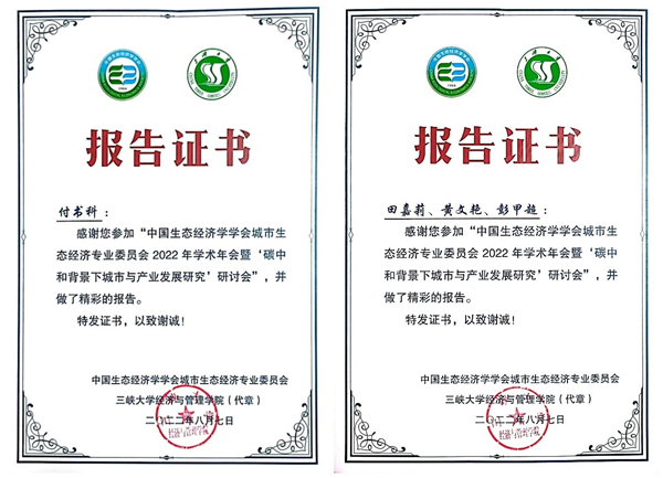 (通讯员 田嘉莉)2022年8月6日,由中国生态经济学学会和三峡大学主办,中国生态经济学学会城市生态经济专业委员会和三峡大学经济与管理学院承办,三峡大学社会科学发展研究院和三峡智库协办的中国生态经济学学会城市生态经济专业委员会2022年学术年会暨“碳中和背景下城市与产业发展研究”研讨会在宜昌举行。法商学院副院长付书科、经济学教研室副主任田嘉莉,管理学院蒋军成副教授,以及2021级金融硕士专业学位研究生刘佳贝、黄文艳参加了此次会议。
