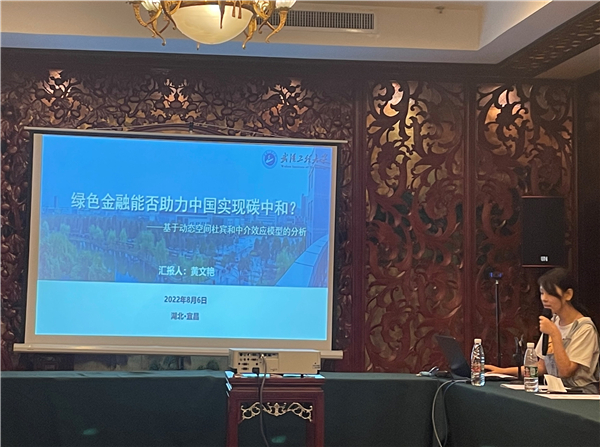 黄文艳以《绿色金融能否助力中国实现碳中和?—基于动态空间杜宾和中介效应模型的分析》为主题,从理论机制、研究设计、实证检验与研究结论四个方面做了汇报。