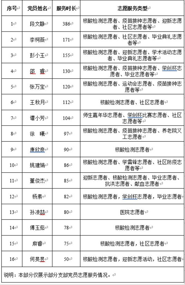 学生第五党支部积极引导支部党员发挥先锋模范作用,在志愿服务中践行为人民服务的宗旨。自2020年9月入学以来,学生第五党支部全体党员积极参加学校核酸检测、社区防疫、疫苗接种、迎新等校内外志愿服务活动,志愿服务累计时长达支2168.2小时。他们用实际行动诠释了共产党员艰苦奋斗、无私奉献的责任担当。