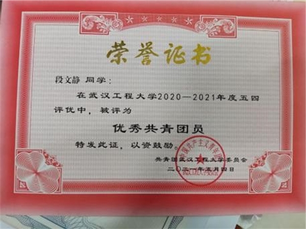 作为一名党员,段文静不断加强理论学习,提高自身素养,积极学习习近平总书记重要讲话精神和党的最新理论,并积极发表学习心得。担任支部副书记期间,她全力配合支部书记完成日常活动,支部结合自身发展实际,严格落实“三会一课”“两学一做”常态化基础上,创新工作形式,挖掘支部工作潜力,所在支部于2022年入选武汉工程大学“研究生样板支部”。她积极参加党员活动,不断发挥先锋模范作用,主动参与党史学习教育主题党课、武汉工程大学“讲好党员故事”专项活动、毕业生党员“最后一堂党课”、“致敬抗疫英雄,弘扬抗疫精神,淬炼红色初心”主题活动,入选学院红色宣讲团,连续两年在党支部民主评议中被评为“优秀”。在段文静看来,政治要强、理论要深、纪律要严、服务要实,是一名合格党员应有的责任和担当。