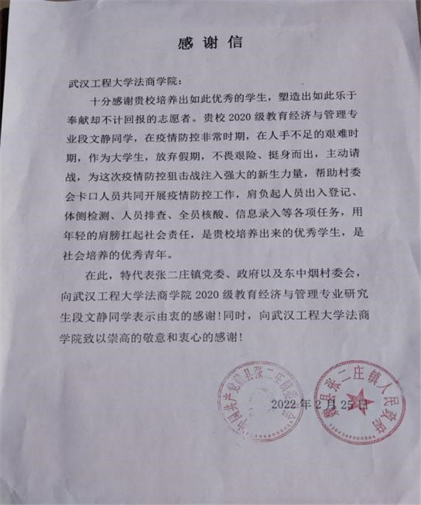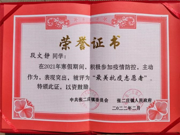 入校后,段文静加入研究生先锋队,多次参与学校接种新冠疫苗、核酸检测、新生入校以及家乡中高风险区人员排查、房屋调查等志愿服务活动,志愿服务时长共计409小时。此外,在寒暑假期间,她主动请缨参加村里新冠疫情阻击战,和村委会干部一同完成村口值班、体温检测、出入登记、全员核酸检测、信息统计等多项工作,守护村民人身安全,践行志愿者服务精神,用自身所学专业和能力回馈给家乡和学校。期间,她连续两次被张二庄镇党委、张二庄镇人民政府以及东中烟村委会授予“最美志愿者”称号。她严格要求自己,将践行“奉献 友爱 互助 进步”的志愿者精神内化成为学习与工作不可或缺的一部分,不断学习和积累,努力提升自我素养做一名优秀的青年志愿者。