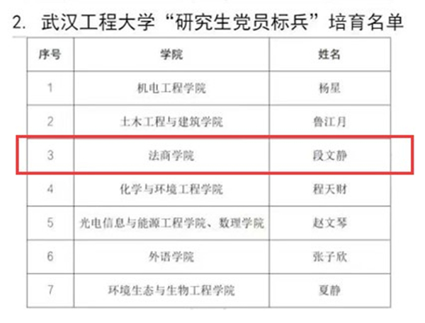 (通讯员 王祥礼)近日,在学校公布的校级“研究生样板党支部”“研究生党员标兵”培育创建立项名单中,我院学生第五党支部段文静同志被评为为“研究生党员标兵”
