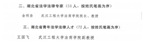 本网讯(通讯员 张晓萌) 近日,中共湖北省委政法委员会、湖北省人力资源和社会保障厅和湖北省法学会联合发布了《关于公布湖北省法学法律人才库首批入库人员的通知》,我校法商学院、知识产权学院金明浩教授、王国飞副教授分别入选湖北省法学法律专家库、湖北省青年法学法律人才库。