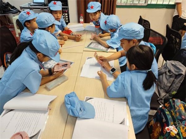 课堂上,小朋友们身穿蓝色红军服,化身各个鲜明的人物角色,以第一人称的身份沉浸式的亲历历史的发展,通过剧本阅读、讲述辩论、剧情演绎、沉浸思考等环节,亲身体验当时历史环境的凶险复杂,与革命先辈进行跨时空的精神对话。