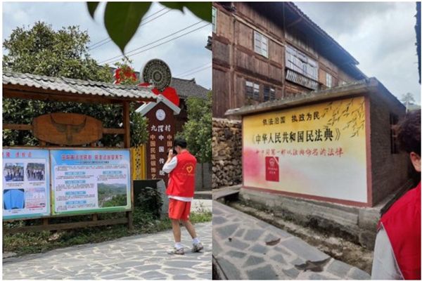 第二站,实践团走进全国民主法治示范村、“苗歌普法”起源地排羊乡九摆村,在村支书杨昌勇和驻村干部吴敏的带领下,实践团成员走过九摆村苗族特色法治长廊和鼓楼,了解九摆村发展历史和苗歌普法发历程及成果。