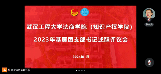 本网讯(通讯员 王颖)2024年1月17日下午3:00,法商学院(知识产权学院)以线上腾讯会议的形式召开2023年度基层团支部书记述职大会,学院团委书记章文杰、2023级本科生辅导员王颖以及来自各年级的42名团支书参加会议。会议由章文杰主持。