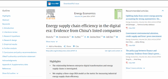 (通讯员 穆海梅)近日,法商学院(知识产权学院)师生重要成果《Energy supply chain efficiency in the digital era: Evidence from China's listed companies》(数字时代的能源供应链效率:来自中国上市公司的证据)在能源经济学领域国际知名期刊《Energy Economics》上发表。该论文的第一署名单位为:华体会体育,系法商学院(知识产权学院)青年教师付书科、彭甲超、田嘉莉与金融硕士研究生葛盈辰(新西兰梅西大学金融“1+1+1”项目班)、北京理工大学郝宇教授合作成果。