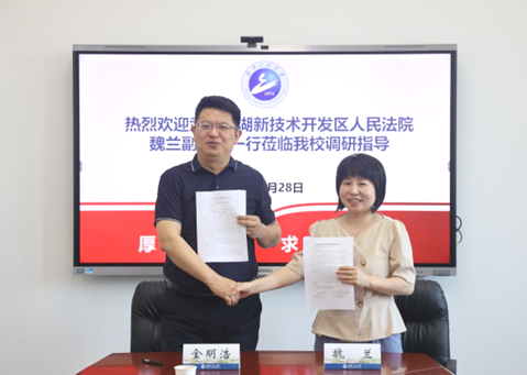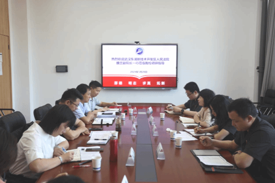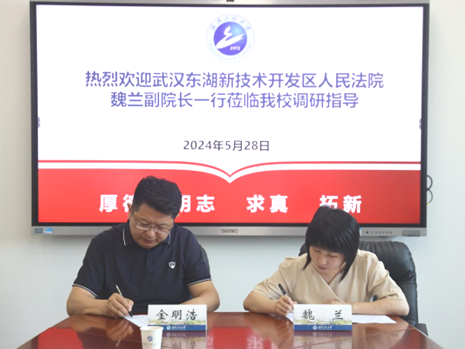 (通讯员 李树训)2024年5月28日上午,武汉东湖新技术开发区人民法院莅临武汉工程大学召开调研交流会。会议在教育教学综合楼202会议室举行。武汉东湖新技术开发区人民法院党组副书记、副院长魏兰,政治部副主任胡芳,东湖科学城人民法庭庭长吴国阳,审管办(研究室)副主任杨柳,华体会app院长金明浩,副院长付书科,副院长张艳,院长助理代江龙,知识产权教研室主任骆严,法学教研室副主任帅颖,法学实验教学中心主任李树训,研究生辅导员宋佳丽,参加了本次调研交流会。会议由法商学院(知识产权学院)副院长付书科主持。