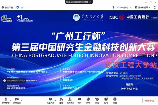 (通讯员 田嘉莉 宋佳丽)2024年6月24日,学院开展第三届研究生金融科技创新大赛线上动员暨经验交流会,法商学院(知识产权学院)副院长付书科,金融硕士(MF)教育中心副主任田嘉莉,研究生辅导员宋佳丽,法商学院(知识产权学院)、计算机学院、电气信息学院相关专业硕士研究生参加此次动员会,会议由副院长付书科主持。