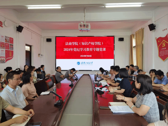 本网讯(通讯员 刘敏)7月4日下午,法商学院(知识产权学院)在学院311会议室组织开展党纪学习教育专题党课。学院党委书记陈朝娟以《深入学习<纪律处分条例>  勤学实干推动学院发展》为题讲授纪律专题党课,学院党委副书记孙勇结合身边典型案例开展了警示教育,学院全体教职工参加活动。