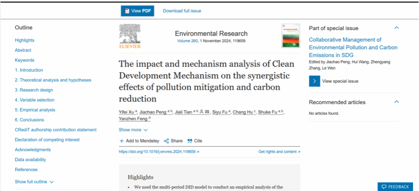 本网讯(通讯员:徐奕菲)近日,法商学院(知识产权学院)2021级经济学专业本科生徐奕菲作为第一作者,“1+X”导师田嘉莉副教授作为通讯作者,在国际权威期刊《Environmental Research》发表论文“The impact and mechanism analysis of Clean Development Mechanism on the synergistic effects of pollution mitigation and carbon reduction”。
