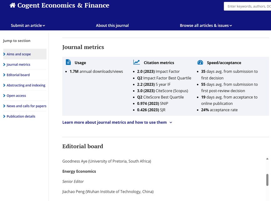 《Cogent Economics & Finance》是Taylor & Francis出版集团推出的Cogent OA系列期刊,致力于推动经济和金融领域知识共享,以其开放获取政策和严格的同行评审过程而闻名。目前影响因子2.0,先后被Web of Science Emerging Sources Citation Index (ESCI)、Scopus、澳大利亚商学院院长理事会期刊目录(ABDC)、英国商学院协会期刊目录(ABS)等收录,覆盖发展经济学、能源经济学、应用经济学、金融经济学、计量和数据分析以及环境经济与可持续发展等六类主题,旨在为全球学者提供一个高质量的学术交流平台。