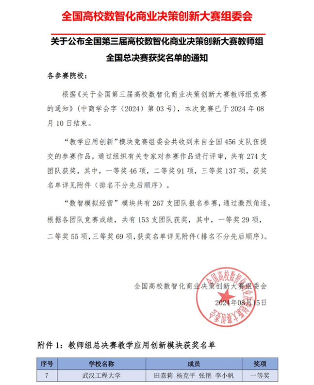 (通讯员 黄炎忠)近日,全国第三届高校数智化商业决策创新大赛教师组全国总决赛获奖结果揭晓,我校法商学院(知识产权学院)教师田嘉莉、杨克平、张艳和李小帆的作品《基于数智化技术的“学问思辨行”教学模式实践——以当代中国经济课程为例》在本次大赛中荣获全国一等奖。