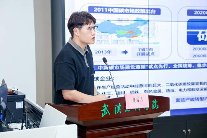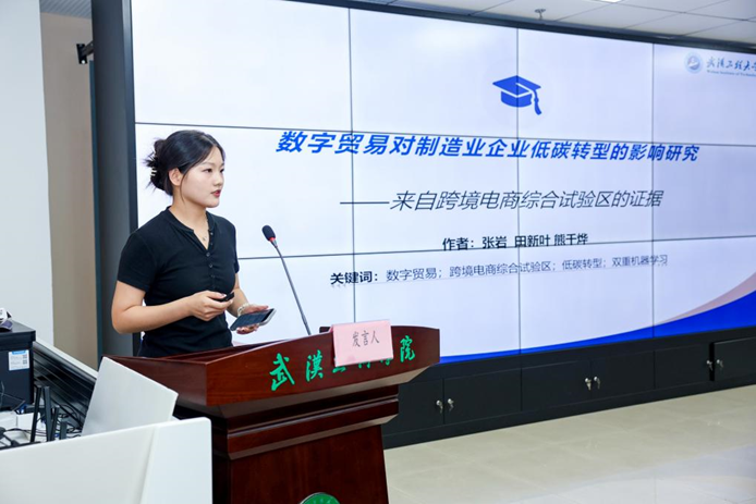 研究生论坛环节,法商学院(知识产权学院)的研究生团队成为现场亮点。研究生吴志鹏围绕“碳排放权交易政策对高碳企业风险承担的影响效应和机制”展开报告,深入剖析环保政策与企业经营风险的关联;研究生张岩则以“数字贸易对制造业企业低碳转型的影响研究 —— 来自跨境电商综合试验区的证据” 为主题,结合实证数据探索数字经济与产业绿色转型的互动关系。两篇报告均紧密围绕绿色发展与数字经济两大热点方向,充分展现出武汉工程大学该学院研究生扎实的科研功底、严谨的逻辑思维与敏锐的学术洞察力。
