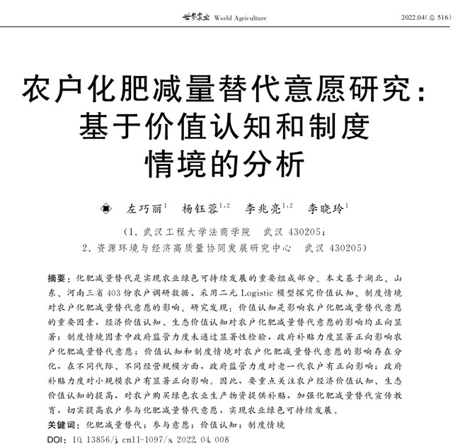 (通讯员 杨钰蓉)近日,我校法商学院研究生左巧丽以第一作者身份,资源环境与经济高质量协同发展研究中心团队成员、法商学院教师杨钰蓉以通讯作者身份在《世界农业》的2022年第4期发表论文“农户化肥减量替代意愿研究:基于价值认知和制度情境的分析”。该刊由农业农村部主管,是中文社会科学引文索引(CSSCI)扩展版来源期刊,主要发表农业经济类论文,展示我国农业国际交流与合作专项的重大成果。