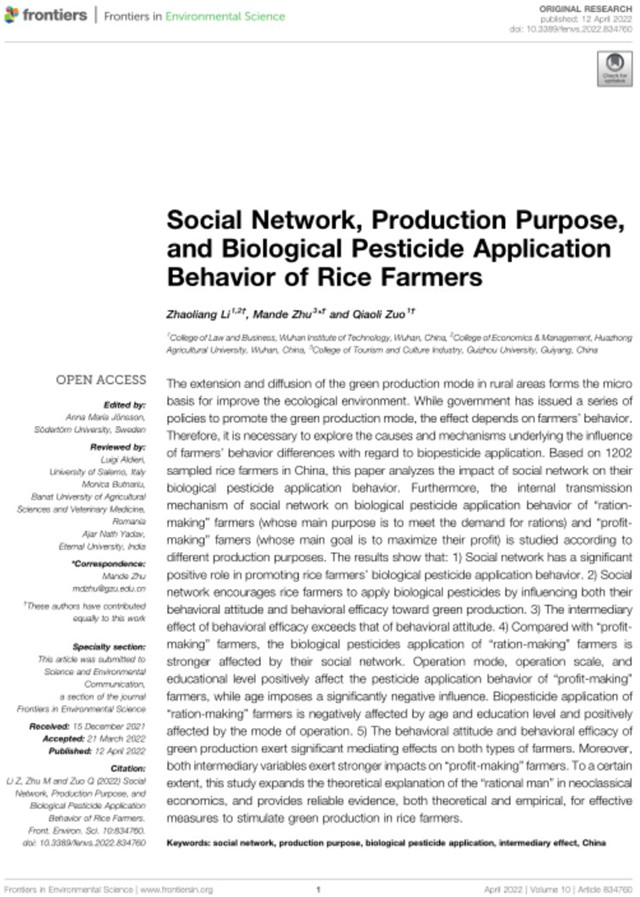 近日,我校资源环境与经济高质量协同发展研究中心团队成员、法商学院李兆亮副教授以第一作者身份、以武汉工程大学为第一单位在《Frontiers in Environmental Science》的2022年第4期发表论文Social network, production purpose, and biological pesticide usage behavior of rice farmers。该刊是环境科学领域的国际知名期刊,是JCR二区学术期刊,主要发表关于自然世界及其与社会各种交叉点知识前沿的论文。
