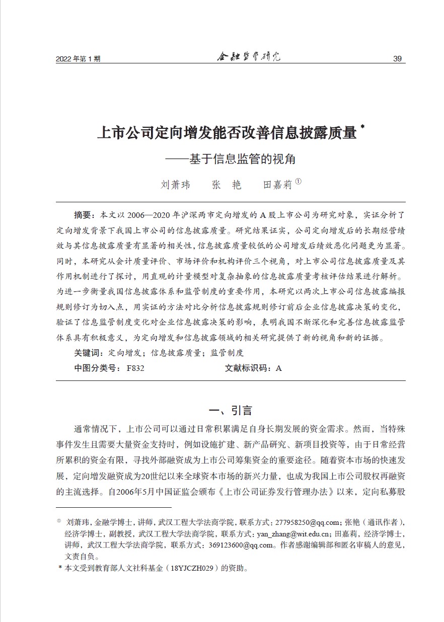 (通讯员 刘萧玮)近日,我校法商学院教师青年教师刘萧玮、张艳和田嘉莉共同合作论文在《金融监管研究》2022年第1期发表,题目为“上市公司定向增发能否改善信息披露质量——基于信息监管的视角”。该刊是由原中国银监会创办发行的专业学术期刊,是中文社会科学引文索引(CSSCI)扩展版来源期刊,主要刊发金融监管、风险管理与金融改革发展等领域的理论研究和政策研究等方面相关的成果。