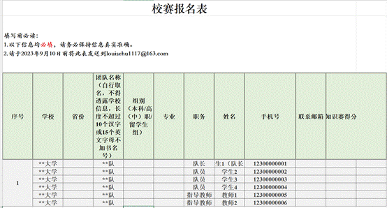 - 校赛:2023年9月19日左右,具体时间待进一步通知,知识赛通过才能参加校赛。 - 4、结果公布:比赛设置一等奖、二等奖、三等奖若干,并推荐优秀作品参加全国决赛。 - 二、报名方式 - 1、每个团队由3至5名全日制在校大学生和1至2名指导教师组成,每名学生只能参加1个团队,不可跨团队交叉组队,教师可跨团队指导,不可跨校组队。 - 2、请有意报名的同学自行组队,填写《校赛报名表》(附件1)和《知识赛考生信息汇总表》(附件2)。 - 4、知识赛报名费30元,请各团队队长收齐后统一上交。 - 5、《校赛报名表》《知识赛考生信息汇总表》请于2023年9月10日15:00以前发送至邮箱louisehu1117@163.com,过时不候。 - 6、如进入国赛,比赛产生费用自理。 - 三、各赛道未尽事宜将在qq群278093494进一步通知。 - 2023年创新创业竞赛武汉工程大学校赛组委会 - 2023年9月3日 - 附件1:校赛报名表