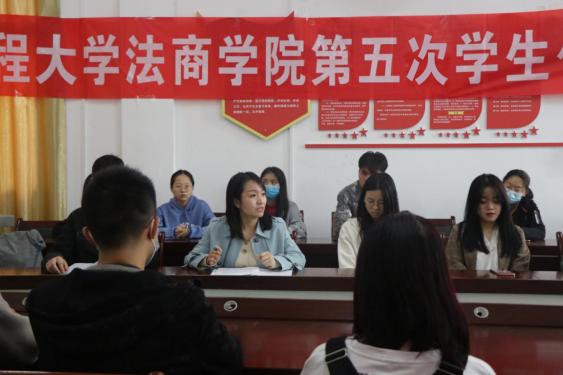 院党委副书记严敏总结了过去一年中法商学院学生会的各项工作情况,肯定了学院第十四届学生会在理想信念教育、院风学风培育、教育教学改革、社会公益实践、文明校园创建等方面所取得的成绩,并且代表学院向同学们提出了三点希望和要求:第一,要树立远大理想,锤炼品德修为,切实发挥示范引领作用;第二,要树立改革思维、遵循问题导向,做广大同学的贴心人;第三,要传承红色基因,弘扬工大精神,勇于担当国家使命和时代重任。希望新一届学生会不负青春不负韶华不负时代,保持优良作风、胸怀昂扬斗志、坚持不懈努力,践行“格物明理 致知笃行”的校训,为建设高水平教学研究型大学和实现中华民族伟大复兴中国梦作出新的更大贡献。