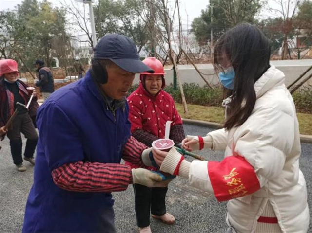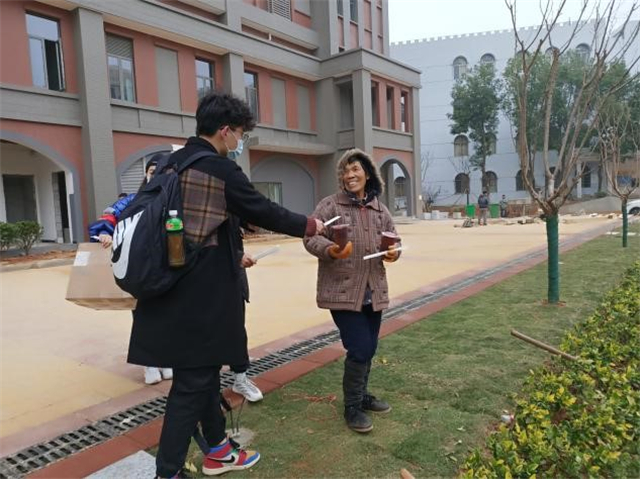 在经过项目工程方许可且确保安全的前提下,法商学院的志愿者们将“爱心”传递给每一位建筑工人,在寒冷的冬日为他们送去暖茶,感谢数月以来每一位工人的辛苦劳作,感谢他们夜以继日,不辞辛苦为工大学子的新家添砖加瓦。志愿者动情地说:“当每一位建筑工人接过'爱心'时,脸上呈现的最真挚最朴素的笑容,就是对我们工作最好的回馈”。