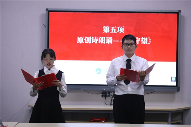 黄群、蔡同羽同学朗诵了法商学院“1+X”梦想直通车志愿服务队的原创作品《守望》。