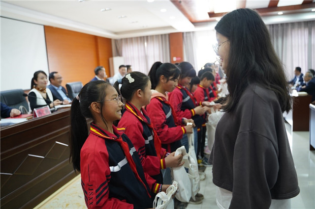 会上,法商学院院长金明浩介绍了学院志愿服务工作及成绩。法商学院“1+X”梦想直通车志愿服务队与黄州区聚星小学结对共建,开展系列党史铸魂促行志愿服务活动。活动现场,志愿者为小学生们赠送书籍和纪念品。