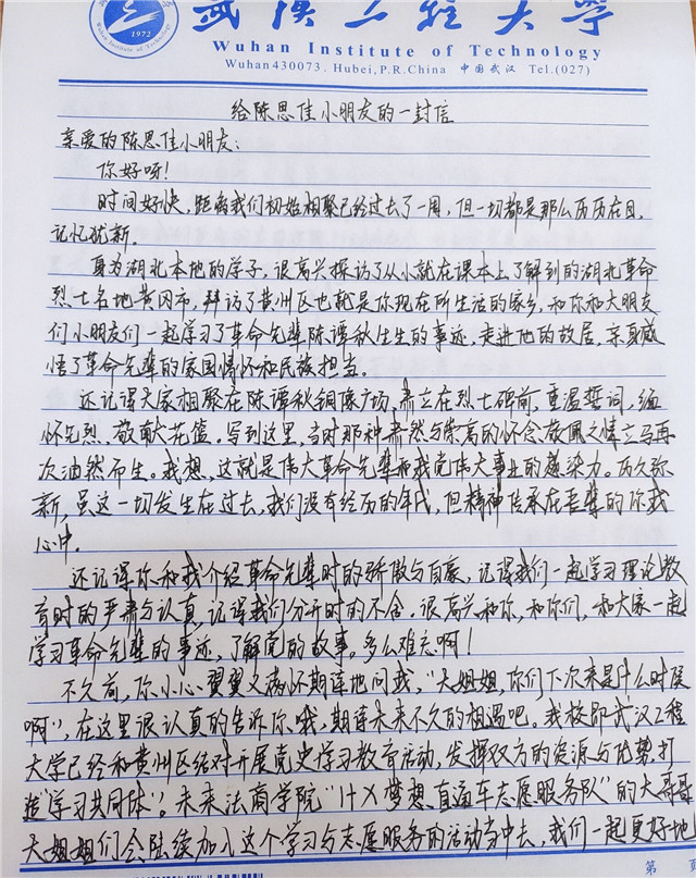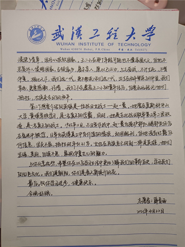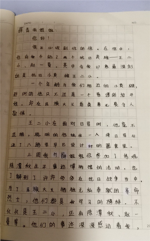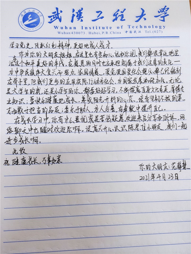 志愿者范静慧在给小朋友陈思佳的信中写道:“很幸运能生在这个和平的年代,爱国早已深入骨髓,在感恩的同时,我们更要肩负起这个时代赋予我们的责任,好好学习、提高本领、勇于担当、乐于奉献,为中华民族伟大复兴贡献力量。”小学生陈思佳表示:“要好好学党史、知党恩、跟党走,将来为建设祖国贡献力量。”