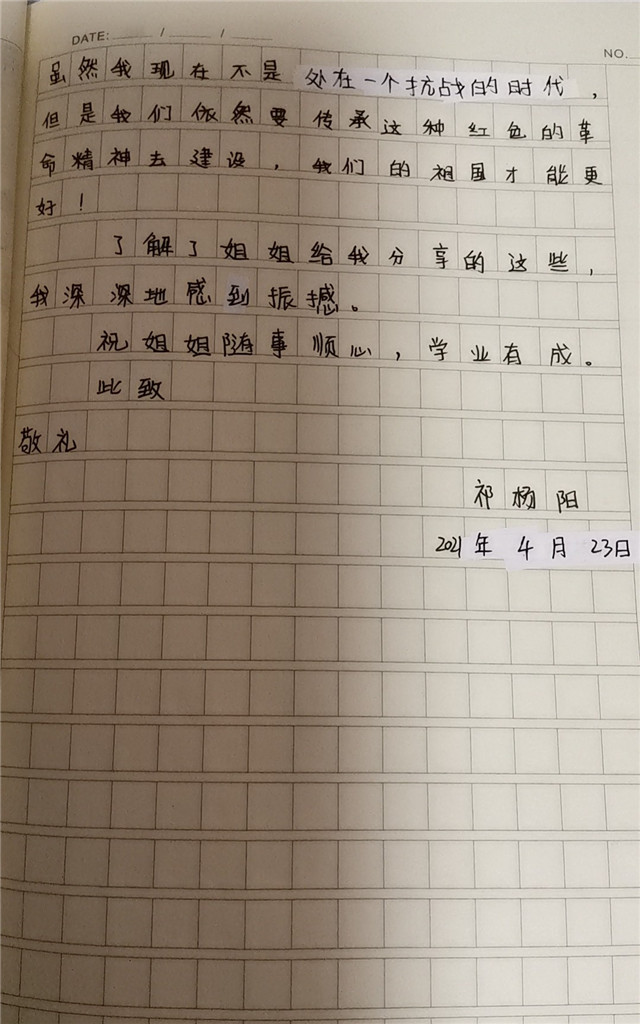 “姐姐,能和你一起学习好开心呀,你送给我的书我正在认真学习,我想给你看看我的读后感。” 志愿者薛青雨带着小学生祁杨阳的期盼与渴望,开启了他们的线上课堂。薛青雨在给小朋友的信中分享了她读红色故事的体会:“红色是太阳、是希望,是战争年代革命先烈的热血,是无数爱国志士的赤子之心;是鲜艳的五星红旗,是奋发向上的理想信念。我们出生在和平繁荣的中国,更要感激和珍惜。我们是朝阳,你们是春天绽放的花朵。让我们一起助力新时代、书写中国梦。”