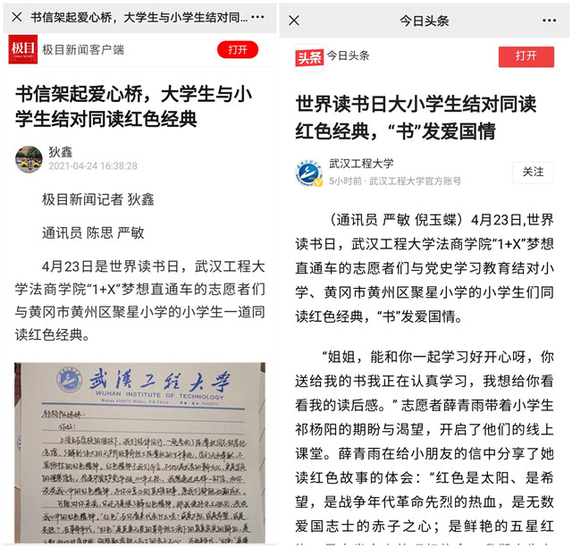 本网讯(通讯员 章文杰)4月23日,世界读书日,华体会体育“1+X”梦想直通车的志愿者们与党史学习教育结对小学、黄冈市黄州区聚星小学的小学生们同读红色经典,“书”发爱国情。湖北日报、湖北广电、楚天都市报、今日头条等媒体聚焦。