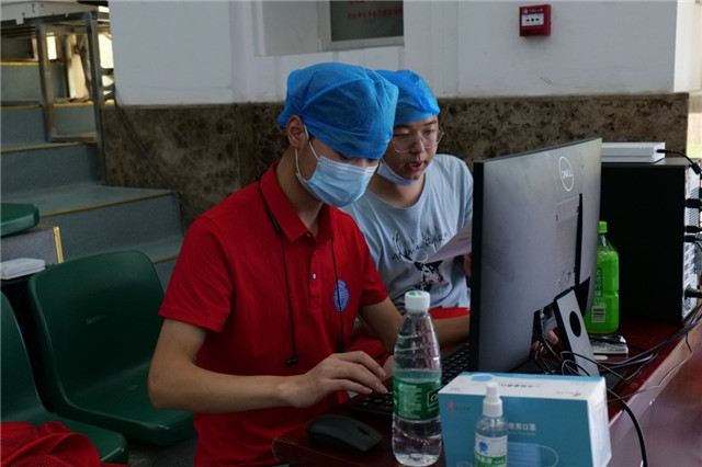 志愿者周欣悦、刘鹏刚在录入核酸检测人员信息