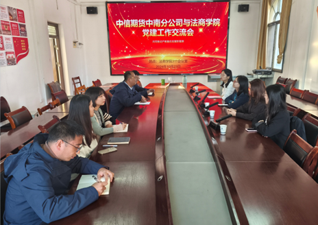 (通讯员 尤喆)为进一步学习贯彻党的二十届三中全会精神,加强校企结对共建促发展,共同探讨如何进一步加强双方在党建工作中的经验与做法,聚集融合事业发展。10月23日,中信期货有限公司中南分公司副总经理冯宇、党支部组织委员方赢一行赴法商学院(知识产权学院),与学院经济学教研室党支部开展党建工作交流座谈,会议由经济学教研室党支部书记尤喆主持。